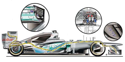 是故,整套雙DRS系統並非單純只是在垂直尾翼內側挖兩個洞而已,它還包括貫穿整個車體的氣流通道(所以它很難抄,因為代價是整個車內結構佈局要重新規劃,當然也包括整部車重新製作;由於Mercedes是在今年新車設計時就包含此系統,一開始就內建了,成本相對較低,領隊Ross Brawn甚至戲稱「只是幾個管子而已」),這套系統本身沒有活動部件,僅是「活用」DRS這個車身上唯一合法可動的空力部件,因此只算是鑽規則漏洞,不算是違規。