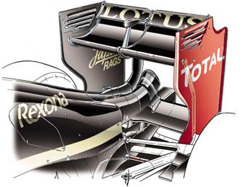 | Lotus的雙DRS:氣流由車頂進入,沿著尾翼中間下方增設的管路往上送。 |