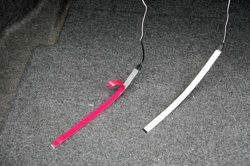 | 線組及燈條發光作棟確認沒有問題之後,便可將燈條進行粘貼動作,建議可用強力雙面膠進行貼附,避免燈條日久脫弱發生。一般兩千中大型房車行李箱尺寸大約可使用兩條LED燈條,小型車或是掀背車,大約使用一條就足夠,當然也可依照你的使用需求作增減。 |
