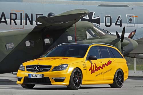 針對M. Benz C63 AMG,德國知名改裝廠Wimmer Rennsporttechnik之前已發表了一款601hp的改裝套件,可讓C63 AMG極速達到329km/h的水準,不過Wimmer RS並不以此為滿,在最近推出這輛性能更為卓越的C63 AMG Estate,以宣示該廠的實力。這輛鮮黃色的C63 AMG Estate旅行車在外觀上,除了紅色Wimmer Tuning字樣塗裝外並沒有太多的著墨,不過在動力方面卻有大幅度的進化,該廠針對C63的引擎本體進行了大幅度的修改,包括汽缸頭、進氣歧管、節氣門等,並換上Sport高角度凸輪軸來提升引擎輸出效率,同時升級了加大汽油泵浦與重新調整ECU程式,使得最大動力從原廠457hp提昇到615hp的水準。此外,為了對應提升後的馬力輸出,一併升級了19吋BBS輕量化輪圈與Dunlop跑胎,加上高檔的KW Club運動懸吊套件和Drexler限滑差速器,讓C63 AMG Estate的性能幾乎可媲美圖片中的私人客機…