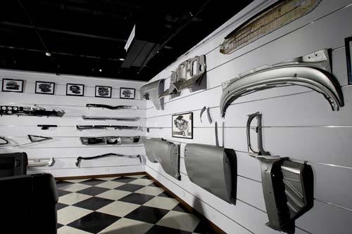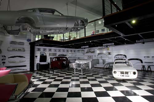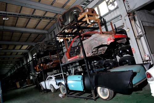 | 廠內堆放了許多經典的美國古董車款,以供工程師進行開發車體套件的工作。 |