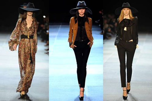服裝方面,開場以黑色帶點叛逆的搖滾煙裝揭開序幕,緊身貼腿褲搭上合身有型的夾克,領口大蝴蝶結搭配展現女性帥氣酷勁;接著以荷葉袖雪紡洋裝及透明絲質蕾絲襯衫,展現出YSL最著名的女性風采。全系列同時也運用許多聖羅蘭大師的經典元素,如:蝴蝶結、麂皮流蘇夾克及斗篷,最後出場一系列以 YSL 靈感女神Talitha Getty風格的雪紡長洋裝,呈現出波西米亞的異國浪漫風情。飾品方面,金流蘇運用在搭配長裙或垂掛於胸口的項鍊,每位模特兒皆一致的寬緣紳士帽搭配服裝,呈現有別於以往的魅力個性感。