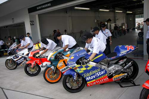 這一字排開由遠至近分別是W.Gardner、M.Biaggi、Doohan、Daijiro等GP500知名車手當年的冠軍座駕。