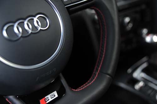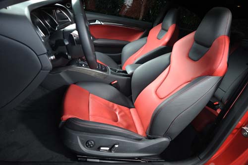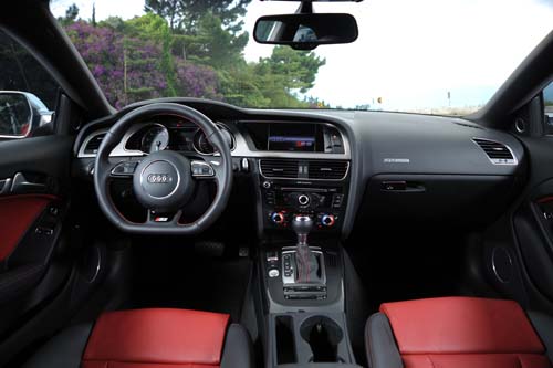 相對於動力系統與外觀的改變幅度,S5在車艙內的改變幅度則沒那麼誇張,上車首先會發現造型經過重新設計的方向盤,新款方向盤採用三幅式設計;當然,多功能按鍵出現在方向盤左右兩側的幅條上,至於下方幅條則裝上了高光澤黑色塗裝的飾板,而實際的握感則延續了Audi性能車常見的較粗環徑,提供了絕佳的手感。改變的部分還延伸到音響主機與空調面板的部分,Audi在這些部分施以高光澤黑色塗裝,試著藉此提昇車艙內的質感;然而對我們來說,這部車內部最具魅力的不是新增的飾板或是方向盤,反而是在小改款前就已經出現的配備──S5專用跑車座椅,這張座椅原本的造型就已是誇張一派,再加上這部車選用了紅黑雙色內裝,更突顯出座椅造型的特色。當然造型好看是這兩張座椅吸引人的部分,實際上它們也提供了非常優異的乘坐舒適性,在激烈駕駛時也提供了充足的支撐性與包覆性。