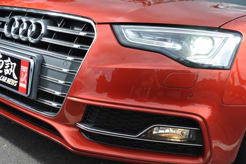小改款對於外觀的修改是一定要的,全新的燈具換上了光纖導引式LED識別燈搭配HID大燈,新式的光源結構為S5帶來了更具科技感的外觀造型,造型也更貼近新世代的Audi車款。除了燈具的改變外,引擎蓋與前後保桿都經過重新設計,進氣口、霧燈也都換上新式的造型;水箱罩也換上了新世代的鑽石型外框與亮面烤漆飾條。雖然車頭車尾的造型都經過修改,不過車身線條倒是維持原狀,最動人的S型腰線完全保留了下來,這項獨特的造形設計一直是S5外觀上的重要特徵。車尾部份,尾燈組也換上光纖導引式LED的結構,如此的設計不僅強化了車輛的科技感,在實務上此類型的燈具也提供了更好的辨識度。相對於隱藏在車身下的性能,S5的外觀造型顯然有些過於低調,雖然Audi該給的裝備一樣沒少,不過在造型方面卻較為低調內斂,我們這次試駕的車輛雖然搶眼,但搶眼的主要原因卻是這部車採用了原廠名為珍珠極勁紅的車色,才讓這部車在車陣中顯得耀眼起來。