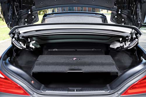 | 在開篷時打開行李廂可以看見特殊的折疊機構,要使用行李空間則得電動升起中間折疊的部分。 |