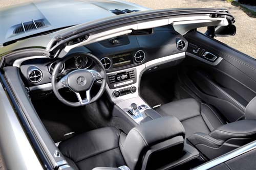 車艙裡的氣氛與前代車款相比顯得更為運動化,看來低扁的中控檯與當家超跑SLS AMG有著相似的造型與風味,多功能方向盤的直徑也配合跑車風味稍微縮小,筒型儀錶板搭配多功能顯示幕的組合當然清晰易讀,不過駕駛敞篷跑車的時候不太需要看著儀錶板,車外的聲響、風景與氣流都帶來比數字更明確的速度感。SL車艙裡的一個特點是位於中央鞍座上的超小型排檔桿,有別於傳統排檔桿的尺寸,它真的只能以嬌小來形容,也讓人想起幾年前推出的限量版CLK DTM街道版上的排檔。實際上駕駛SL要用到排檔桿的機率極低,如果要手動控制檔位,透過方向盤後方的換檔撥片就可以輕鬆完成。