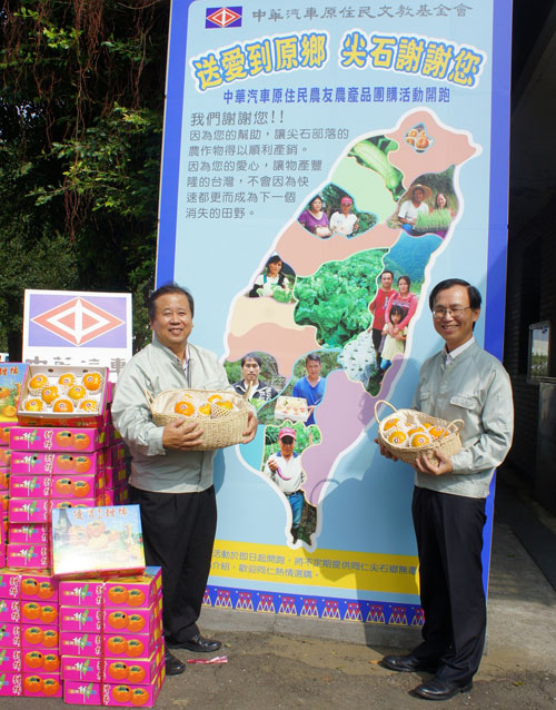 尖石鄉位於新竹縣境內,擁有天然的地理條件及氣候環境,在原民農民努力改善栽培技術下物產豐隆,但因長期受到中盤商的剝削,導致產銷遭遇到嚴重的困境。為增加尖石鄉農作物銷售管道,中華汽車自今年5月起與「鄰鄉良食」共同合作,陸續於廠內推廣尖石鄉高山蔬菜、水蜜桃、天然果醬及甜柿等多種有機作物,透過同仁自發性的力量,共採購了20萬元農產品。中華汽車總經理劉興臺表示,這次的團購很有意義,中華汽車動員了全廠的力量,短短一個星期團購數量達到農民甜柿總收成量的三分之一,不僅有效的解決農友農作物產銷問題,對於原鄉部落永續發展也有極大的幫助,而後續我們也將持續投入原民蔬果助銷活動,幫助更多原民朋友。