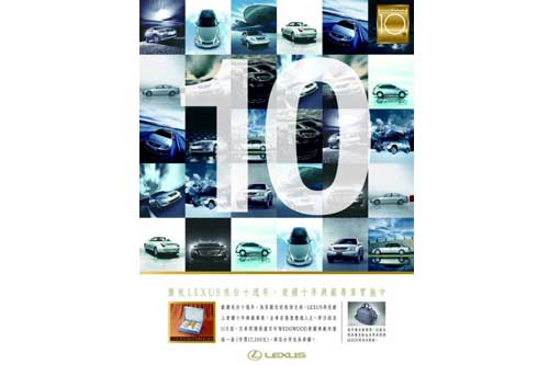 和泰汽車為慶祝Lexus在台上市十周年,自即日起至11月底止,推出榮耀十年典藏專案。凡活動期間來場客戶即獲贈精美印刷的Lexus品牌故事一本(數量有限,送完為止),購車客戶可享全車系購車零利率優惠。