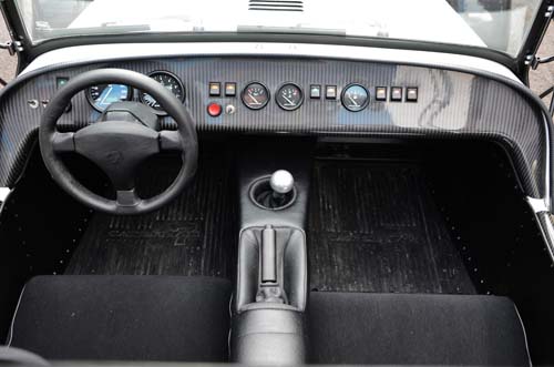 | 選配Superlight後,整個儀錶板控檯改為碳纖維架構,除了速度錶與轉速錶外,還包括機油量、水溫與油錶。位於紅色按鈕(引擎啟動鈕)右方的扭子開關為方向燈(轉向完成後需手動切回中間),至於左邊的則為Pass燈及遠近燈開關,而剩下鋪陳於控檯上的雨刷、暖氣(需選配)、大燈開關及警示燈等,也使用簡單的船型開關,極簡約的設計與一般的房車相較可是天壤之別。 |