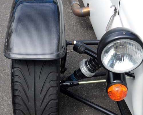 | 外露的前輪為一大特點,採操控至上的雙A臂懸吊在本車之上也是一覽無遺,土除部分在以輕量化訴求下以碳纖維套件妝點。 |