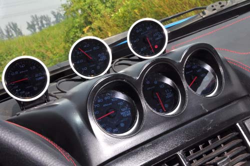 | 六顆外掛儀錶暫時取代了R34 V-SPEC上的LCD顯示幕,不過這六顆儀錶也恰好顯示了顯示幕中所顯示的數據。 |