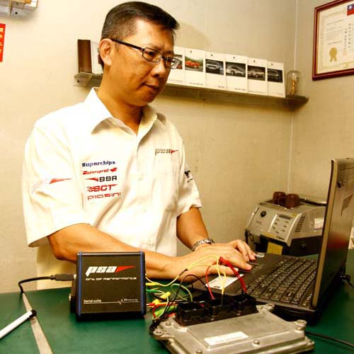 而PSA採取所謂「走後門」的方式,也就是透過特殊的解碼器從從數百支電腦Pin腳中找出正確的幾支端子進行連接,如此才能順利將原本的ECU中下載程式,然後傳輸到國外給專門負責撰寫程式的專業工程師,同時由本地工程師提供改裝的相關資料與實際的空燃比值與爆震值,協助國外工程師調校出最適合的供油點火程式,國外技師將程式調校修改之後再將程式回傳,接著國內技師再將修改過的程式傳輸至原本的ECU中,進而取代原廠程式。