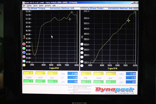 | 由Dynapack的馬力曲線圖(右側)來看,動力的輸出相當線性,這就是機械增壓最大的特點,不像渦輪增壓會有lag的區塊。扭力曲線部分(左側),依舊是踏下油門曲線就隨即往上攀升,在4000rpm到8000rpm之間也形成了一個扭力平原。最大馬力616.3hp/8172rpm 最大扭力55.4kgm/7579rpm |