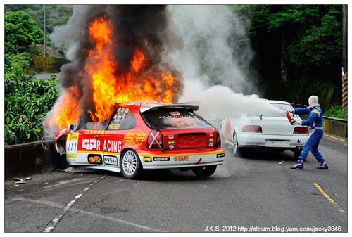 還好在撞及發生後,路邊的觀眾立即上前協助腳部受傷的二哥離開陷入火海中的車輛脫困,而擔任副駕駛的二嫂也毫髮無傷,不過這輛陪伴二哥16年之久的EK廠車可就沒那麼幸運了,即使隨後車手紛紛停車協助滅火,但火勢實在太大整輛車被燒個精光,事後在拆解引擎時才發現原來撞擊時的力道太大造成油軌斷裂,導致汽油被高熱的排氣管所引燃,最後才會造成一發不可收拾的火勢。