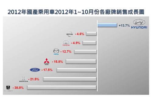 國產乘用車市場一向是車商兵家必爭,在9月份仍有半個月在民俗中,繳出了11,688輛的情況之下,相較整月都是銷售月的10月繳出的16,267輛,僅多出9月份4,579輛,成長率僅達39%,銷售成積不算理想。2012年直至目前為止,1~10份的國產車市場總量僅達184,777輛;反觀去年(2011)同期達205,360輛,還少了20,583輛,整體國產乘用車市場衰退 10%,看起來車市已受到整體經濟成長率接連調降的影響。