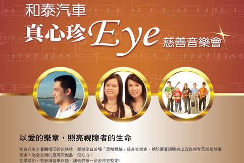 和泰汽車於今年首次舉辦「和泰汽車 真心珍Eye愛盲慈善音樂會」公益活動,特別於音樂會入口處設置「黑暗體驗通道」,讓聽眾在全黑的環境中行走,希望明眼人可以將心比心,親身體驗視障朋友們的辛苦與感受!整場音樂會也全部由視障朋友擔綱演出,包括台北市立啟明學校、逆光飛翔-黃裕翔、中國好聲音-張玉霞、Life爵士樂團和愛盲樂團等,現場沒有華麗的布景,也沒有炫目的燈光音效,但卻有最真摯的音樂,能帶給聽眾滿滿的感動!音樂會結束後有慈善自由樂捐活動,希望募集大眾的捐助及愛心,現場募款所得及音樂會售票所得都將全數捐贈台北市立啟明學校和愛盲基金會,期盼為視障朋友盡最大的心力。