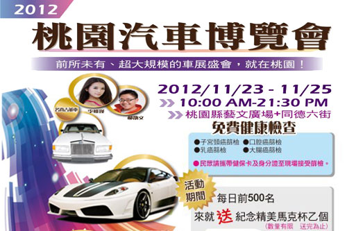 「2012桃園汽車博覽會」將於11月23日至25日在桃園縣藝文廣場及同德六街,集結全球各式名車400輛,正式開跑!開幕儀式將由桃園縣長 吳志揚帶領各界貴賓一起用香檳酒為「2012桃園汽車博覽會」的冰雕汽車加油,期望讓所有參觀者滿載而歸。