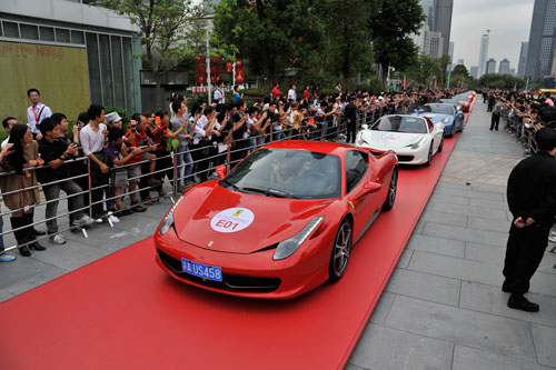 車隊抵達曾成功主辦2010年廣州亞運會開幕式的海心沙主會場,現場數以千計的Ferrari 法拉利愛好者和各界嘉賓齊聚一堂。Ferrari 法拉利董事長盧卡•迪•蒙特澤莫羅先生駕駛著爲中國市場量身定制的龍年限量版Ferrari 法拉利458 Italia緩緩駛入會場中心,面對現場熱情的來賓,蒙特澤莫羅先生發表了激情洋溢的演講,感謝廣大車主、車迷及各界對於Ferrari 法拉利一如既往的支持,以及所有出席本次慶典人員的努力和參與。現場的Ferrari 法拉利車迷和嘉賓不但感受了完美的童聲合唱和激情四溢的熱舞,更被前F1車手和2012年WEC世界耐力錦標賽冠軍車手詹馬里亞•布魯尼 (Gianmaria Bruni) 帶來的458 Challenge賽車表演所折服。Ferrari 法拉利卓越的性能及賽道文化在熱情彌漫之下被演繹至極致。
