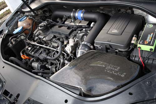 對於Golf GTI來說,K04或是GT2871套件都算是不難見到的改裝選擇,不過對於店家來說,勇於嘗試不同的套件才能獲得更寶貴的改裝經驗。以往在日系車的改裝範疇中,使用TD系列的渦輪大家都不陌生,但使用在歐系車上就不是那麼普遍,而這輛五代Golf GTI就是換裝TD05渦輪的最佳示範。本車所使用的渦輪為TD05 18G,一般像Impreza或EVO安裝這具渦輪對應馬力約在300hp~400hp之間,因此相當適合五代 2.0 TSFI引擎使用,因此Tuner特別為此車選用BCS專為Golf GTI開發的TD05渦輪套件。而該套件包含了專用鑄鐵頭段、TD05 18G渦輪本體與全套管路,由於五代引擎先天體質不如六代,因此在供油部分還須換上噴油嘴與汽油高壓泵浦,才能夠供給足夠的供油量來達到最佳動力輸出。