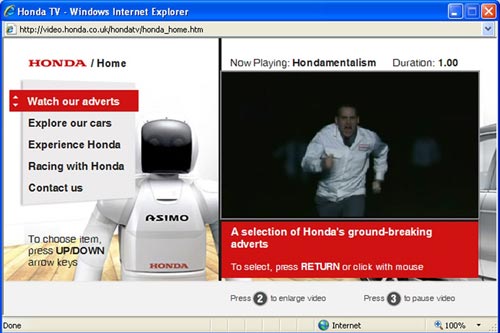 這個由英國本田架設的網站,定義為ONLINE TV CHANNEL。依據原廠說法,在這裡每月將提供至少80支影片供網迷隨選溜覽,號稱具備非常容易使用的隨選介面,提供涵蓋了F1一級方程式賽車、快艇與HONDA品牌電視廣告等充足的影片內容。
