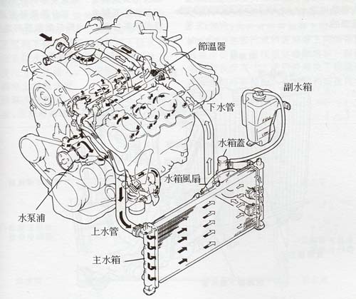 | 水冷系統的作動,大致是從正時皮帶或外加皮帶驅動水泵浦,使冷卻水能在汽缸的水套內流動帶走高溫(小循環);接著當水溫高到一定程度時節溫器即會打開,從下水管引入經水箱散熱後的冷卻水行大循環動作;此刻假使溫度仍然高居不下,水箱風扇同時將隨之運轉以強制散熱。 |