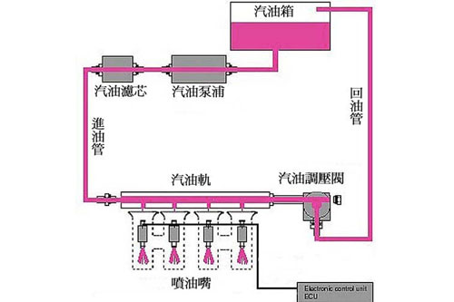 上述提到的所有元件,都是供油系統中不可或缺的重要零件,但要使噴油嘴提供正確的噴油量,有一個環節是需特別注意的,那就是「燃油壓力」的穩定與控制,至於調整燃油壓力的元件即為「汽油調壓閥」,該元件通常位於油軌上,長得很像一個小飛碟,且其上有一條接到進氣歧管的真空管,該管路就是用來調整燃油壓力用的,有些改裝車會將此調壓閥,改成可手動設定壓力值的改裝部品,目的在提高燃油壓力,強化燃油霧化效果,並增加低速時的供油量,使引擎低速扭力反應好些,但卻會有高速反應不佳、耗油的問題,因此建議使用該項產品時,最好能搭配改裝電腦,一併修整高低轉速的供油量,才能發揮其效果。