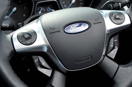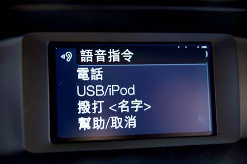 | Ford Sync整合系統的語音設定就在方向盤右後方,按下後雙手不需離開方向盤,可以直接以聲控方式控制選單。 |