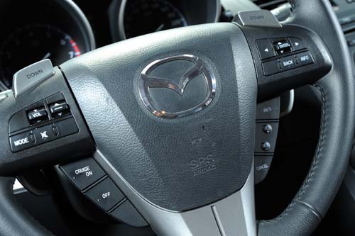 | Mazda3未能將換檔撥片的升降檔作一左一右的設計增加便利性,這是相當可惜的地方。 |