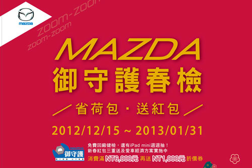 凡於2012年12月15日至2013年1月31日MAZDA「御守護春檢」期間內回廠,就能享受御守護29項車身安全項目免費專業健檢,維持愛車最佳狀況,確保年節期間的行車安全,還能參加「紅包三重送」活動。