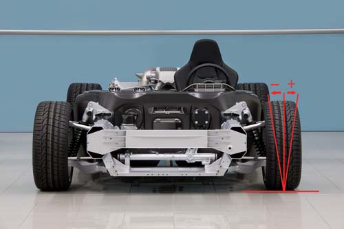 | 束角(Toe Angle)的定義為自車身上方俯瞰時,左右輪朝外側展開的角度。當輪胎前緣小於後緣時,則為「內束角」(Toe-In),反之若前緣大於後緣時,則為「外束角」(Toe-Out),此角度會大幅影響直行穩定性,設定角度過大時會使輪胎邊緣出現羽毛狀磨耗痕跡。 |