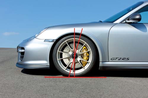 | 後傾角的定義是從車旁向車輪看時,前懸吊的傾斜角度。此角度愈傾斜車輛直行的穩定性愈強,反之則有利於轉向的靈敏性,兩者無法兼顧。如果左右兩輪的角度不一致的話,車輛直行或踩煞車時會偏向角度較大的一邊,對行車安全有極大的不利影響。 |