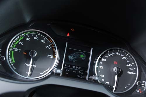 為了對應Hybrid動力系統,Q5 Hybrid在MMI與儀錶板等部位都進行了相關的變更,最明顯的差異出現在儀錶板上,位於儀錶板左側、傳統的轉速錶被特製的動力錶所取代,讓駕駛人可以更精確地掌握動力系統的工作狀態。原本的水溫錶部分也更換成為電池殘量錶。MMI多媒體系統內也追加了新的功能,以圖像的方式顯示車輛的動力系統運作狀態,當然在儀錶板中央的多功能顯示幕也能同步顯示動力系統的運作狀態。