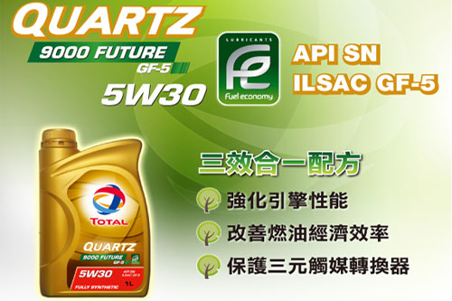 從GF-X系列的認證來看,GF-5相較於前一代的GF-4規格,在對於燃油經濟性(Fuel Economy) 、活塞的潔淨度(Piston Cleanliness)以及渦輪增壓器的保護 (Turbocharger Protection) 等方面,都提出了更嚴格的要求,這也是為什麼獲得GF-5認證的TOTAL Quartz 9000 FUTURE GF5 5W30一上市,就獲得了許多車主的高度評價。在TOTAL秉持一貫對安全、健康及環境的尊重,以及研發團隊對於減少毒性風險及揮發性有機化合物排放…等等的努力下,如今兼得魚(機油品質)與熊掌(節能減碳)已不再是夢想。