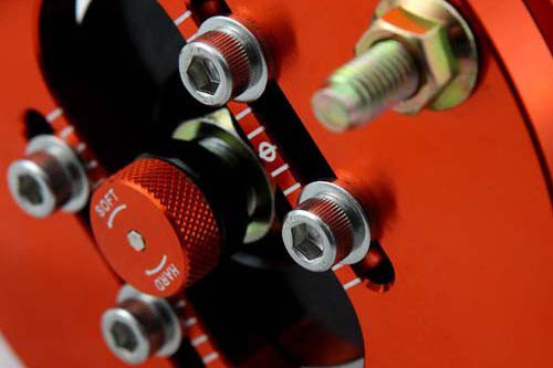 改裝避震器並不是安裝上車就好,後續的調校可是相當重要的一環。過去提到避震器分為彈簧與減震筒兩大部分,目前市售改裝避震器大部分都已經配好彈簧的硬度與阻尼,而阻尼可調避震器還可以針對組尼軟硬進行微調,阻尼的定義,就是當我們以一固定之速度壓縮或拉伸避震器時,其所產生的阻力稱之為阻尼。這阻力來自於避震器作動時,活塞會把阻尼油加壓使其通過小孔徑的閥門,如果改變閥門的孔徑就可以改變阻尼的大小。