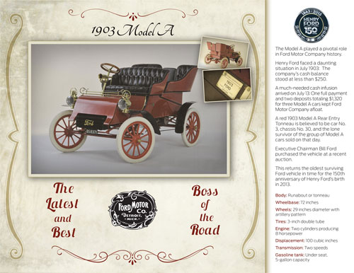 Model A對福特汽車來說,有舉足輕重的歷史意義。1903年7月,當亨利•福特面臨可用資金不足250美元的巨大困境時,一筆Model A的全額車款和兩筆訂金共1,320美元的及時出現,幫助福特汽車公司渡過難關。這輛於福特汽車創辦人亨利•福特誕辰150週年活動中重返家園的 1903 Model A Rear Entry Tonneau據說就是當年拯救福特汽車公司的其中一輛,同時也是當日售出三輛車中唯一僅存的 Model A。