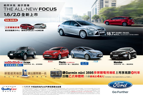 福特六和汽車公司為感謝廣大車主的支持,並慶祝THE ALL-NEW FOCUS上市以來熱銷成功,在農曆新年前特別推出「從心開始 回饋為您」優惠方案,本月份凡購買Ford Mondeo,Fiesta,Escape 和Focus 四門汽油時尚經典型以上等級之車款,即可獲的Garmin nüvi 3595高畫質多媒體電視導航機(市價$11,990) 以及高額零利率。此外,凡購買Ford Mondeo,Fiesta和Escape車款,再可加碼獲得最高價值近4萬元之乙式車體險。