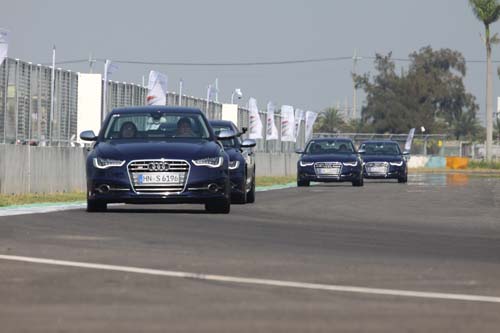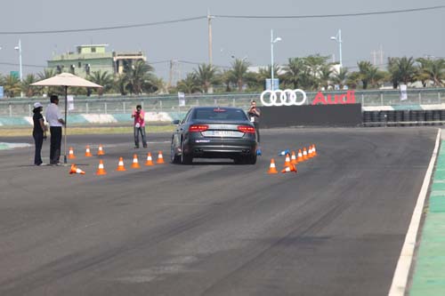 緊接著所來到的課程也是國內駕駛最欠缺的緊急應變反應「ABS Emergency Break緊急煞車操控測試」,這最主要的目的也是希望能透過模擬道路上緊急況讓駕駛能夠確實發揮車輛所搭載的煞車輔助系統,包含ABS、ESP、EBD交互合作之應變能力,由於測試車款為Audi S8,在高達520hp/66.3kgm的動力輸出下當車輛進入預定測試路段時速已達100km/h,此時駕駛不僅要發揮出「功夫」的瞬間腳力踏下煞車,同時間雙手還必須輕鬆轉動方向盤以避免車輛碰撞到路上錐筒。