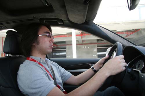 | 記得喔!這個課程就是要拿出男人的真功夫,用力「幹」下煞車,但是上半身還是要保持最輕鬆的姿勢來轉動方向盤。 |