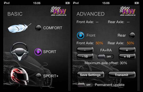 | 因應電子懸吊風潮,KW避震器特別推出DDC ECU coilover kit版本,駕駛者可在車上透過按鈕自由切換「舒適」、「運動化」與「運動化+」三種阻尼模式,或透過iPhone對前後懸吊做個別的避震器軟硬調整。 |