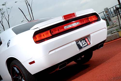 相較於新世代的Mustang及Camaro的外型,Challenger在詮釋老一代車型的復古與經典功力可說更勝一籌,外觀造型彷彿就像是70年代的車款一般,無論是車頭四圓燈,還是細長四方造型的水箱護罩以及橫跨車尾的長排紅色尾燈,皆流露出濃濃的復古風味,再搭配上修長低扁的車身輪廓,讓Challenger儼然就是從40年前直接穿越時光而來的經典老車,只不過在十足的原創風格中,又融入了現代的造車工藝與科技,讓整個外型散發出無限迷人的風采與魅力。而更特別的是,此次試駕的Challenger乃是屬於較高階的Rallye Redline特仕車型,全白的車身(另有金屬銀、金屬鎢及深黑等車身供選擇)再搭配上由跑車化引擎蓋一路延伸至車頂、行李廂蓋到擾流尾翼的專屬紅色賽車條飾,以及獨特的20吋黑/紅特仕烤漆鋁圈與P245/45R20 Firestone Firehawk跑胎,不僅強化了視覺效果,更為整個外型帶來強烈的性能氣勢。