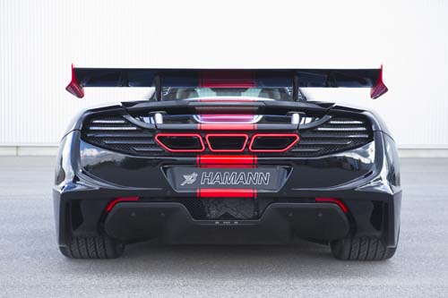 由於寬體造型之賜不僅讓更大的輪拱可容納Hamann 21吋輪圈與寬胎,藉此同時可增加車身軸距與抓地力,採用單孔輕量化設計的「Unique Forged formula」幾乎可媲美專業賽車配備。至於車尾方面後下分流器整合於後保桿之中不僅展現出超跑應有寬闊氣勢,藉由大型尾翼還可有效增加後軸的下壓力,而獨特的三孔式排氣尾管設計絕對也是突顯Hamann最鮮明的家族特色。在此同時Hamann也竭盡所能替MP4-12C進行內裝奢華升級,舉凡碳纖維材質、麂皮與真皮材質的需求皆可滿足買家,而以上「memoR」所需升級費用也只要9.5萬歐元即可一圓個人美夢。