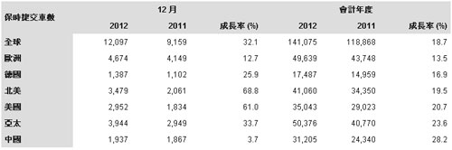 保時捷 2012 年銷售了史上最多台的跑車,共有 141,075 輛新車交付給客戶,與去年同期比較成長 18.7% (2011 年:118,868 輛)。保時捷 CEO Matthias Müller 先生於日前開幕之底特律 (Detroit) 車展表示,由於保時捷全體的優秀員工,使得我們能夠成就此傑出的結果,我們已做好準備,面對充滿挑戰的 2013 年。在過去的三年裡,位於斯圖嘉特的保時捷汽車公司的新車交車成長率已達到 83.9%。
