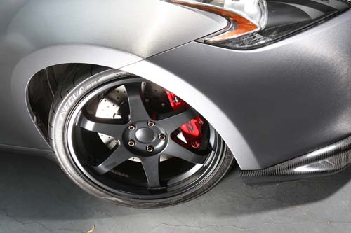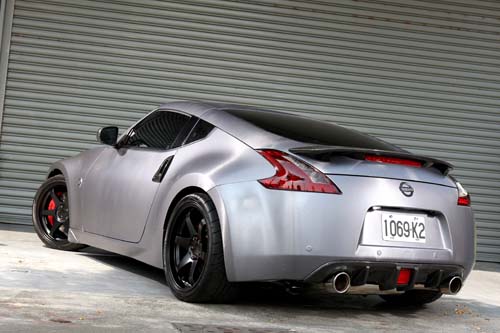儘管髮絲紋貼膜這比起一般材質的貼膜在施工方面還要複雜不少,價格也比較貴一些,但完工所後呈現出的效果卻是相當有質感,尤其是在這輛擁有簡單線條卻非常性感的370Z上,更能夠展現出一種獨特的高級車感受,再加上本車基礎的改裝,包括19吋Rays TE37啞黑色輪圈、Yokohama AD08跑胎、D2大六活塞煞車系統、D2氮氣瓶避震器、Jordan排氣系統以及碳纖維前後下巴、尾翼、後照鏡、門把等套件,讓這輛370Z彷彿就像是一輛超跑等級的改裝車。
