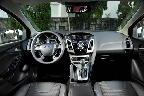 Focus 2.0 GDi整個內裝的設計感與用料質感相當出色,尤其整個中控檯皆以軟質塑料進行包覆,方向盤、排檔座、手煞車拉桿以及車門飾板等處也皆縫製皮革,再搭配鋼琴烤漆面板以及金屬飾板,為車艙帶來媲美高級房車般的高質感氛圍。車艙內的焦點配備,除了具多種控制按鈕的多功能方向盤外,就是深具跑格的飛行式雙筒儀錶板,而中央的多功能行車資訊顯示幕可說相當厲害,可提供平均油耗、剩餘里程、平均速度以及Eco Mode節能引導模式等資訊等顯示,功能之強可說國產車少見。此外最具賣點的就屬「SYNC中文娛樂通訊整合系統」,此系統能整合藍牙手機、多媒體數位播放器,駕駛只要透過方向盤上的控制鍵就能以語音操作,進行音樂播放及電話接聽與撥打,是一相當先進貼心的高檔配備。安全配備上也不遑多讓,標配有ABS+EBD+BAS煞車系統、ESP車身動態穩定控制系統、斜坡起步輔助系統以及4具氣囊。