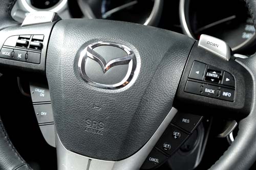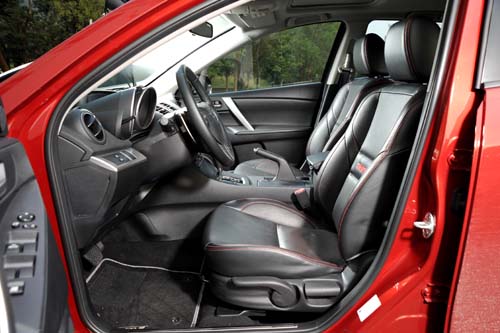 Mazda 2.5S頗具跑格的內裝設計很對年輕人的口味,儘管塑味頗重但細部處理還算細膩,而小改款車型之後重新設計的中控檯與音響空調面板,人體工學設計也經過細膩的調整,使操作上變得更為就手;車艙內的焦點配備,除具備換檔按鍵的多功能方向盤以及雙筒式的高反差儀錶外,就屬中控檯頂端的MITS旅程電腦與MIDS多功能資訊顯示系統,車內所有行車相關資訊與設定皆透過這兩套系統進行操控,其他配備包括HID頭燈、Push Start引擎啟動鈕、定速、雙區恆溫空調系統、雨滴感應式雨刷以及光感應自動啟閉頭燈等皆俱全,整體配備水準與Focus 2.0 GDi相當。在安全配備上的規格,包括ABS+EBD+BAS煞車系統、DSC動態穩定系統皆不缺,不過僅配置雙前座2具氣囊是較為可惜之處,畢竟其他兩車皆端上4具氣囊的水準。