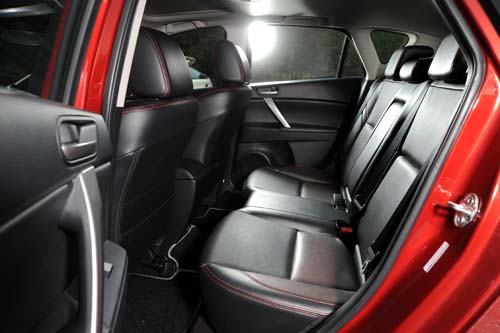 Mazda3 2.5S雖然擁有三車中最長的車身長度,但軸距卻是最小,也因此其後座膝部空間在相形之下會顯得較為窄小,實際乘坐後,乘員的膝蓋離前座椅背只有1個拳頭,寬敞度遠不及其他兩車,但所幸軟硬適中的座椅泡棉以及符合人體工學設計的椅背角度,能為乘員提供舒適且支撐性不錯的乘坐性。