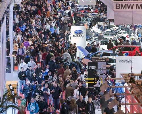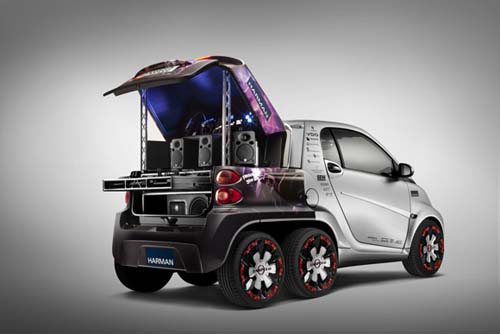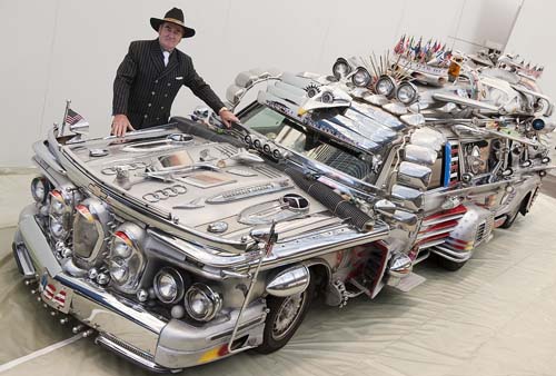 Essen車展還有許多視覺系創意改裝車款,不過所有車加起來都沒有這部Finnjet怪異。Finnjet猶如科學怪人般由兩部M.Benz 300TD及其他四十部各式車輛零件所拼湊而成,全車有三組輪軸,除了300TD的渦輪增壓柴油引擎外,還包括多達四十部車輛的86組頭燈、36組後照鏡及三組電池,當然車身上還貼滿各廠牌的廠徽,這也難怪這部車重達3.4噸。