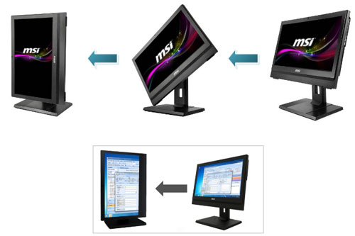 為了讓AP2021更能符合各個行業需求,MSI導入可高度調節之腳架提供使用者採用,可高度調節的腳架設計(樞軸旋轉、左右旋轉、高低、傾斜)更能符合各種應用。在樞紐旋轉部分,MSI也引入智慧型手機、平板電腦擁有的Auto Rotation功能,當螢幕翻轉90度之後,使用者不用自行透過軟體手動調整,AP2021便會隨著螢幕自動翻轉畫面,大大提昇適用性與方便性。( 建議售價 28,900 NTD )