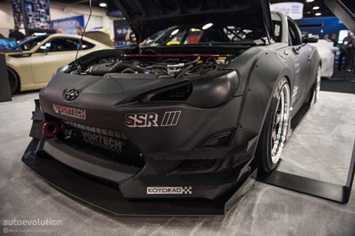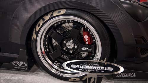 至於車體的部分,採用前後寬體葉子板讓兩側輪距增加至少10cm以上,並使用向兩側擴張的側裙來修飾整個線條,輔以賽車樣式的胎圈與Brembo卡鉗,讓整車完全符合GT樣式。而在動力部分,本車使用Vortech V-3機械增壓套件來進行動力升級,內裝則是安裝全套防滾籠、賽車椅與賽車方向盤,營造出標準GT廠車的感受。其實本車外觀看來雖然很接近GT賽車,不過外觀的碳纖維樣式都是使用包膜的方式來達到視覺上的效果,說穿了這其實就是一輛為了參加比改裝車比賽而生的改裝車,真正下場比賽恐怕還是不如真正的賽車。